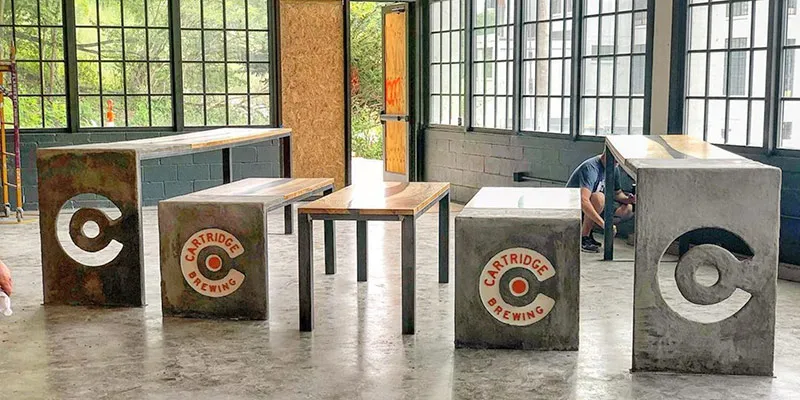 The tops became river tables of ThickSet Epoxy and white oak, which he first sealed with TotalBoat Penetrating Epoxy. The legs are steel and concrete, which creates the contrast Harris loves. Since the brewery is located in the former historic Peters Cartridge Factory, he incorporated the aged brass the company used to create the cartridges.