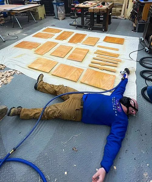 Harris splayed out after spraying cabinet doors with TotalBoat Halcyon Clear Gloss Varnish