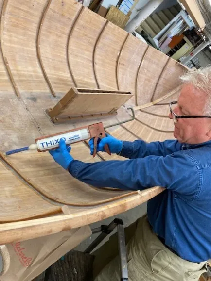 Above: Honan using TotalBoat Thixo adhesive for a glue-up