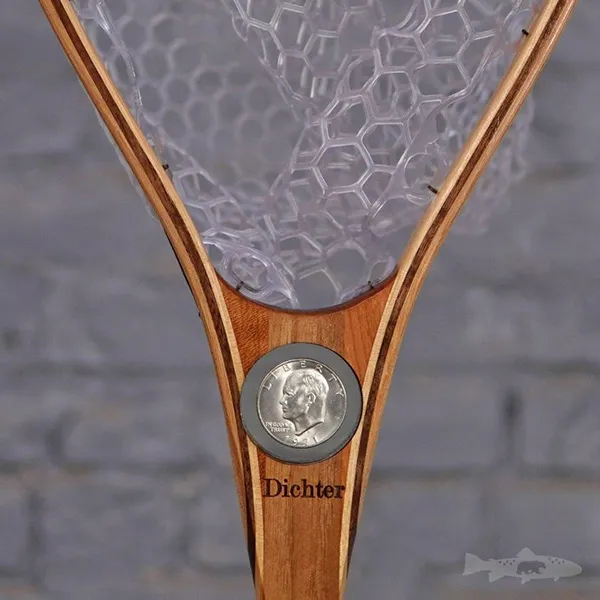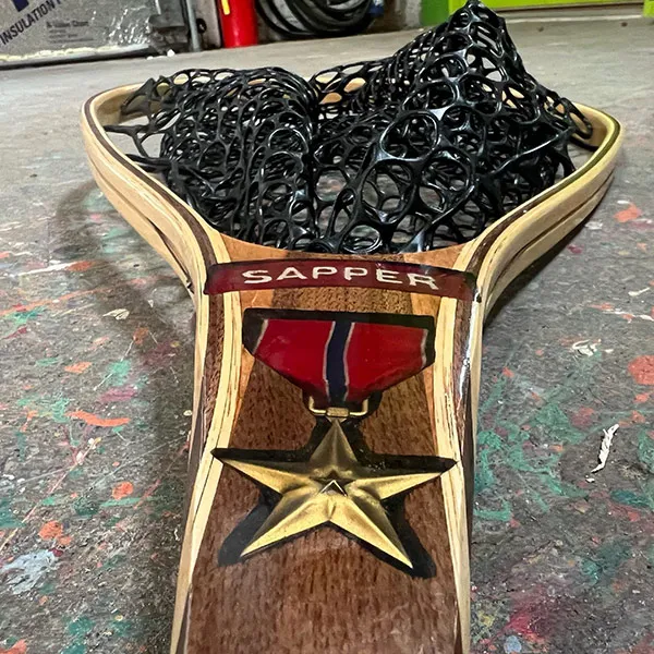 Above: A net made with purple heart wood, with a medal inlay at the bottom