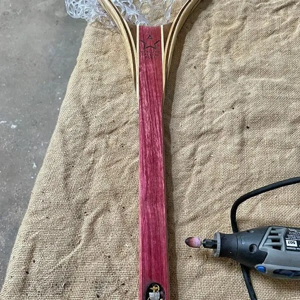 Over the years, the designs became more intricate because Lewis wanted to challenge herself creatively. After gluing up the wood for the net, she begins sketching the design in black and white. She then inverts the image and runs it through her laser. However, she found that as the designs became more intricate, this wasn’t enough, so started incorporating a Dremel tool into the layering process. She even uses a hot glue gun to achieve color separation. After a delicate sanding of the design, Lewis does touch-ups with more epoxy.