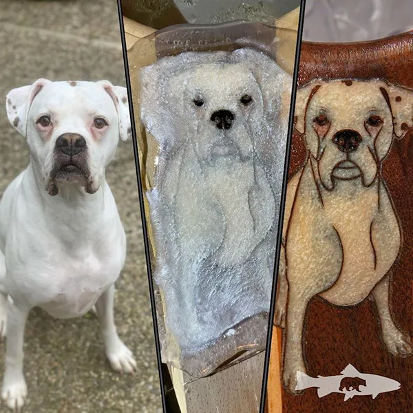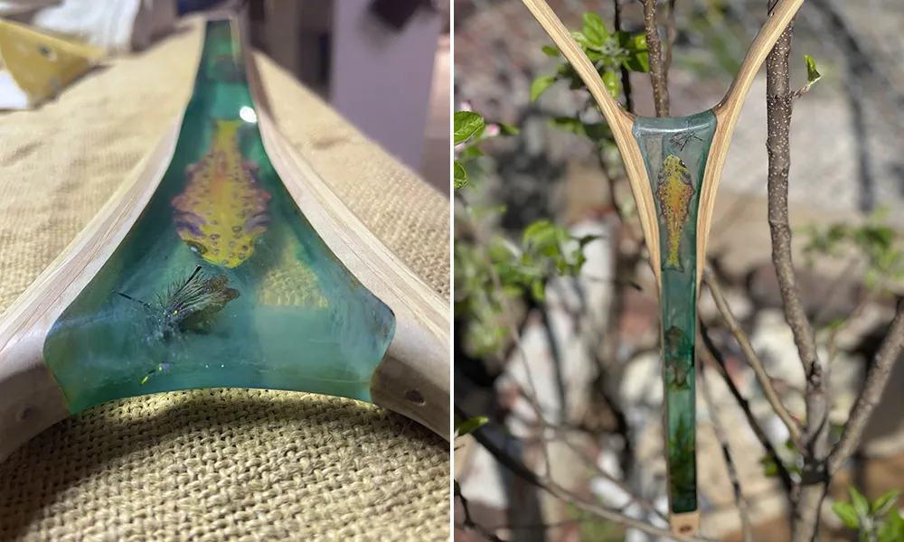 In early 2020, a friend asked her to make a custom fly fishing net. With a history in woodworking and art, Tina jumped on the opportunity and was pleasantly surprised by the reactions from family and friends. The design was a simple one, a bear inside a fish, and Lewis executed it with the TotalBoat epoxy they had lying around for a boat restoration.
