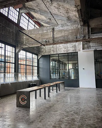 The tops became river tables of ThickSet Epoxy and white oak, which he first sealed with TotalBoat Penetrating Epoxy. The legs are steel and concrete, which creates the contrast Harris loves. Since the brewery is located in the former historic Peters Cartridge Factory, he incorporated the aged brass the company used to create the cartridges.