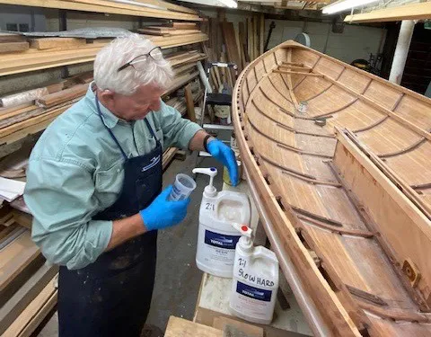 In addition to High Performance Epoxy, Honan’s other TotalBoat staples include Penetrating Epoxy to seal the wood, Thixo epoxy adhesive for glue-ups, TotalFair epoxy fairing compound for its long working time, TotalProtect barrier coat to prevent pitting below the waterline, and Wet Edge topside paint to finish the builds off nicely.