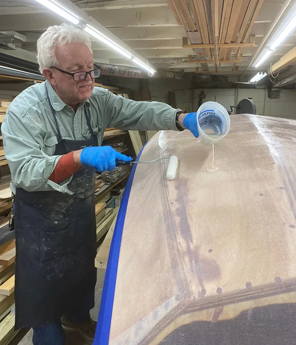 Above: Honan prepping to fiberglass a build with TotalBoat High Performance Epoxy